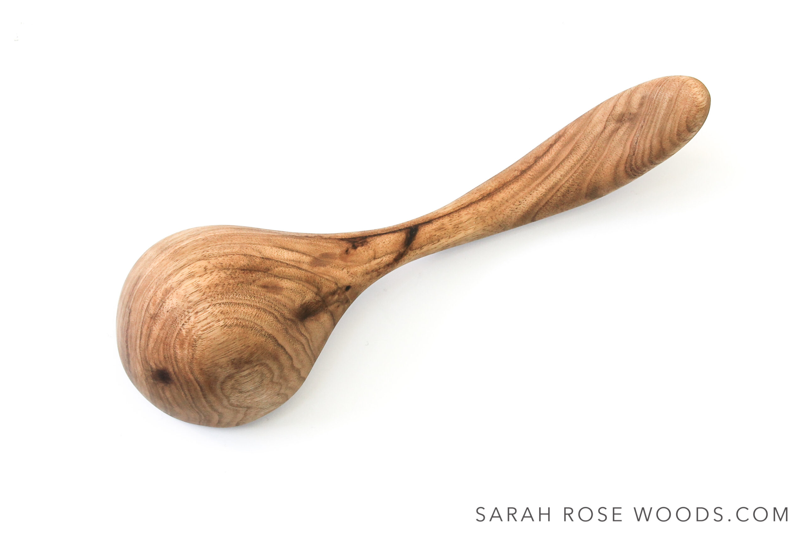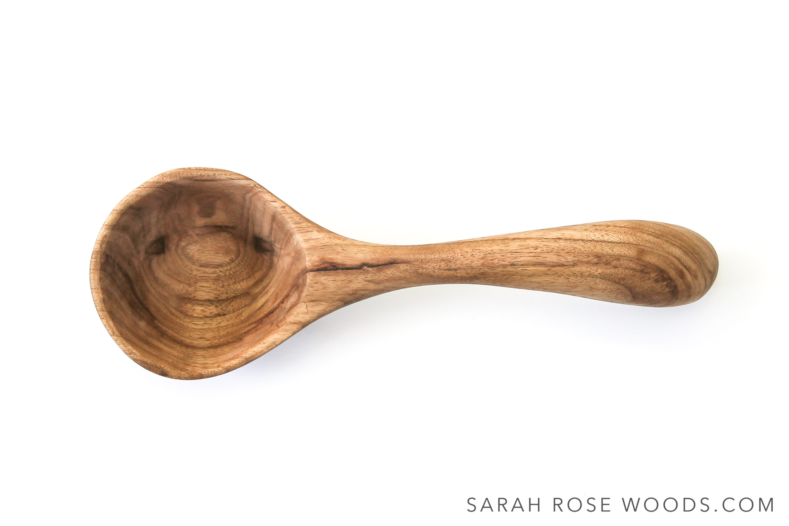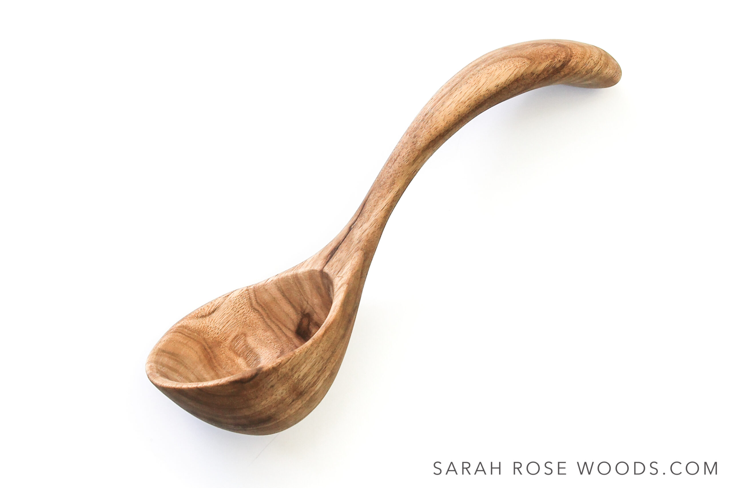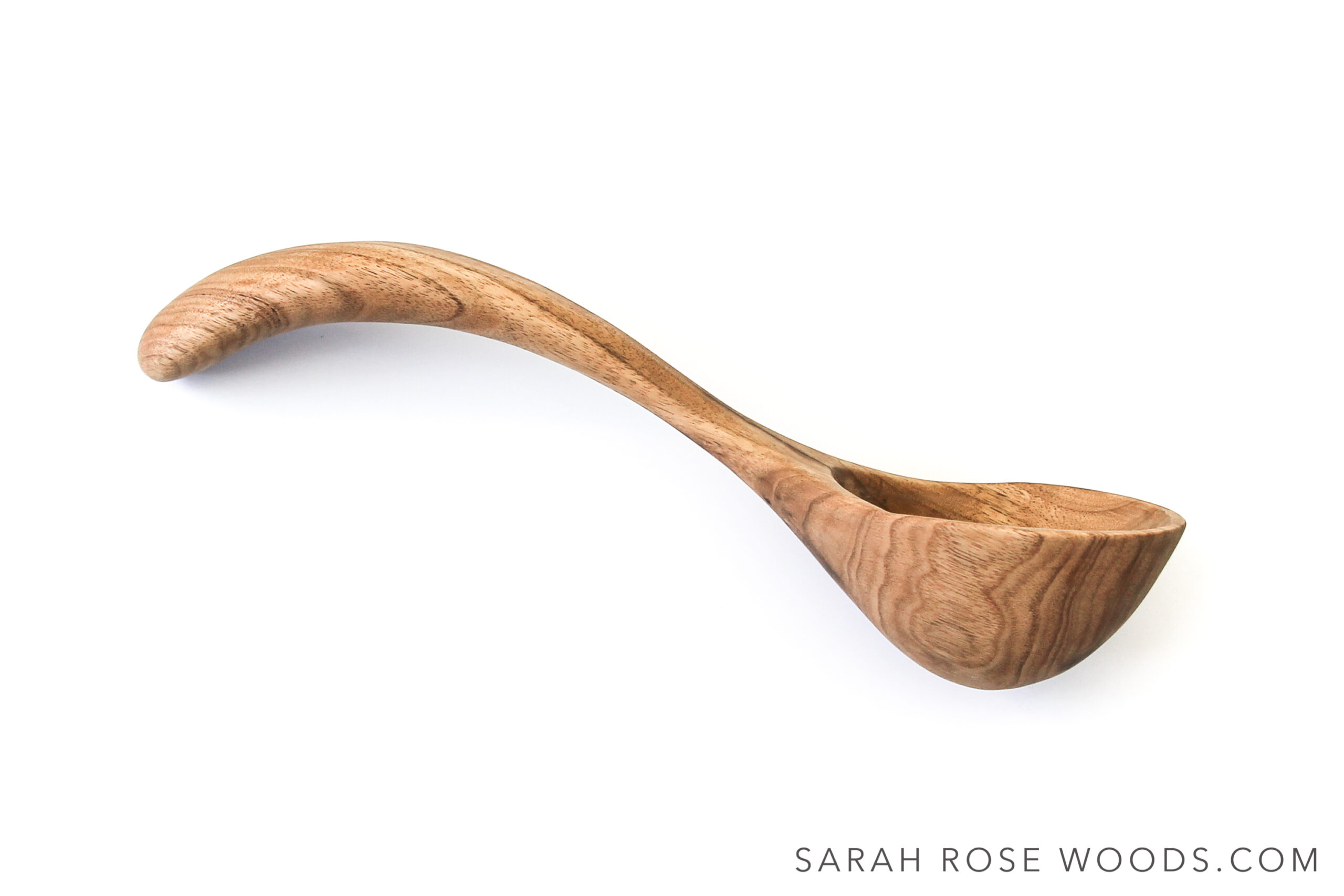 This deep ladle can be used for tasting and serving, and is a gorgeous decorative addition to any kitchen. The shape was hand drawn, then cut out in two directions on the bandsaw. Next, the bowl was hollowed with gouges, and the hande was carved with whittling knives. The spoon was then meticulously sanded. The natural colour of the White Walnut woodgrain was enriched with organic coffee grounds before being sealed with food-safe finish.